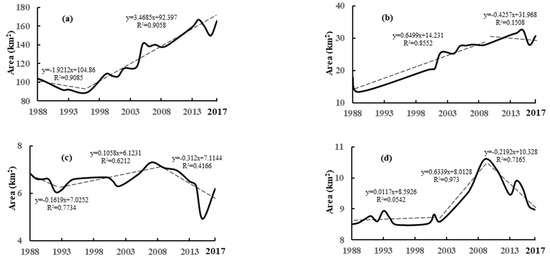 Changes of area in Lake Yagenco (a); Lake Zhamcomaqiong (b); Lake Zhamuco (c) and Lake Gaeencuonama (d) during 1988–2017.