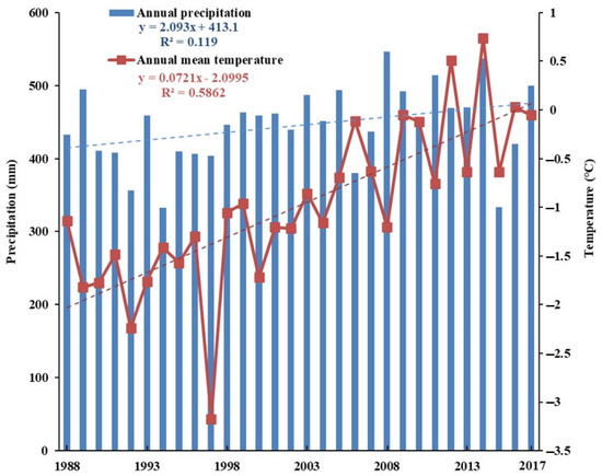 Changes of the annual mean temperature and annual precipitation around the study area during 1988–2017.
