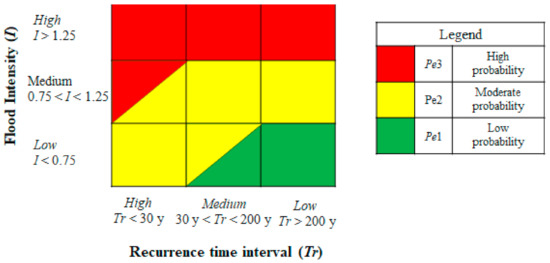 According to the Decree Law no. 49/2010, the states of the variable hazard, which represents the probability that the establishment is subject to a certain flood scenario having a given intensity (I), are represented by the combination represented in Figure 2. The flood recurrence time (Tr) intervals are defined as in the x axis according to a semi-quantitative equation [27,28], Tr is correlated to a combination of the extent of the flood, the water depths and the flow rate; the flood intensity is defined as in the y axis and is bound to the height (h) and speed (v) of the water as well as to a factor (Debris Factor—DF). This factor is related to the amount and dimensions of sediment transported and the probability that debris will lead to a significantly greater hazard depending on the land-use as shown in Table 1 [29].