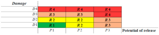 The Na-Tech Risk Index (Rnatech) is the target node in the BN. It is represented by four states that are derived by combining the potential of release of hazardous substances and the damage as given in Figure 3.