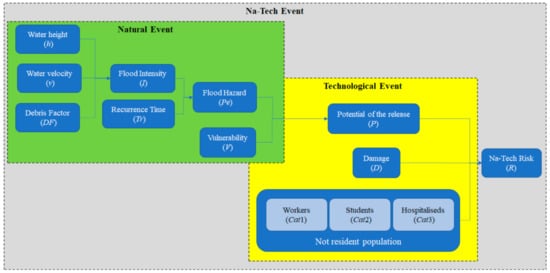 Figure 4 gives a flow-chart that summarises all the variables involved in the elaboration of the Na-Tech risk. As shown in the figure, the methodology is composed of two parts, i.e., the assessment of the flood risk (probability of release of the hazardous substance) and the assessment of the Na-Tech risk associated with the release of the chemical in the environment. In this framework only the assessment of the hazard and risk related to the flood are defined by the Italian Decree Law no. 49/2010 [17]. The second part refers to the Decree Law no. 105/2015 [33] and the Seveso Directive [9].