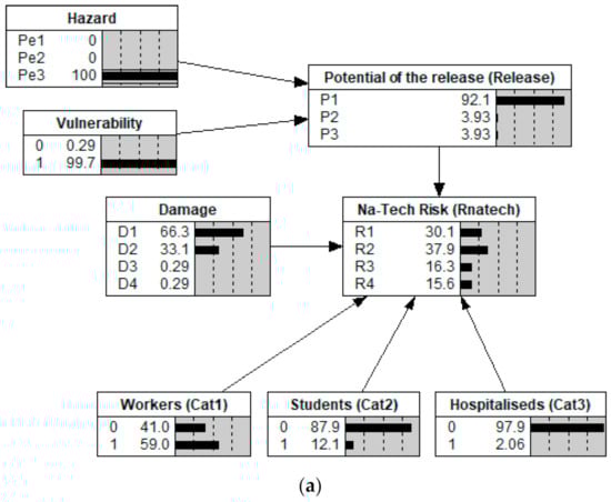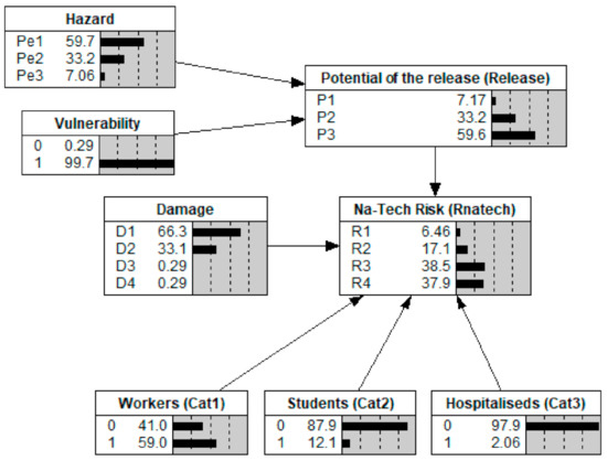 The BN, built on the basis of the Na-Tech risk model of Section 2.1.1, is given in Figure 7. It allows estimating the updated distribution of the states of the risk index when there is a change in the system, which causes the availability of new information that may have a positive or negative effect on it and consequently implications on risk management.