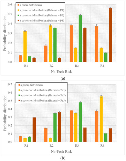 Changes in the target node due to the occurrence of a flood event (a) evidence on the “hazard” node for the occurrence of an event Pe3; (b) evidence on the “workers” node for the presence of people.