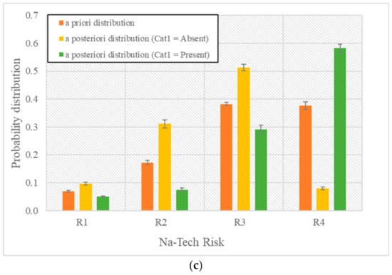 Cross-validation results for Na-Tech Risk: average a priori and a posteriori probability distribution when (a) the node Release assumes 100% at each state (b) the node Hazard assumes 100% at each state and (c) the node Workers (Cat1) assumes 100% at each state.