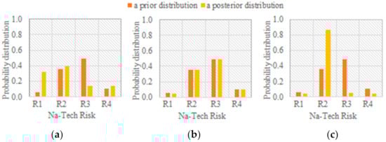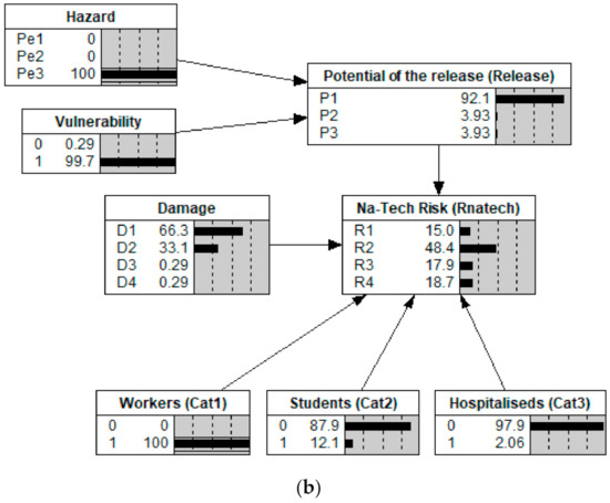To demonstrate how the BN works for the updating of the Na-Tech Risk index, the following example is given. The occurrence of the least serious and most frequent flood scenario is assumed (i.e., Pe3). Figure 9a shows the change of the distribution of states of the target node after a finding is introduced in the hazard node. A decrease in the probability of R4 and R3, compared with the initial situation (see Figure 8), is observed, while R1 and R2 increase. This means that if a natural event having a modest entity as Pe3, the probability of serious consequences due to the Na-Tech event is low, while lighter consequences are more probable. By assuming that the event occurs during a working day, it is possible to include another information in the Bayesian model, which relates to the presence of workers during the event (Figure 9b) by introducing a finding on the proper node. The Na-Tech Risk index node is updated, and it can be observed that the probability of a low-risk index (R1) significantly decreases, while all the others increase, especially the rise of R2 is about 10%.