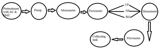 In the pilot plant (Figure 2), both adsorption and membrane filtration processes were integrated to mitigate membrane fouling. Pretreatment with the adsorbents (AC and MAC) was performed in a reactor that was linked to a membrane system. To ensure thorough adsorption before the membrane treatment, each of the adsorbents was separately mixed with AZM solution 2 h before feeding to the three membranes viz., UF, NF, and RO. The UF treatment was done in a dead-end mode, whereas the cross-flow mode was followed for the other two membranes i.e., NF and RO. Pretreatment with MAC was carried on a specifically designed electromagnetic assembly. J and % R were measured for AC and MAC.