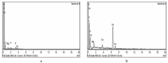 The elemental analyses of adsorbents (AC and MAC) are shown in Figure 3a,b. The EDX spectra of AC showed a characteristically high peak of carbon. Small peaks of oxygen, calcium, magnesium, and phosphorus were also observed due to impurities, which originated from the raw sawdust. The deposition of Fe3O4 on the MAC surface resulted in a lower carbon peak as compared to its complement adsorbent AC. Other elements presented in MAC, such as chlorine and oxygen, were also detected along with a lower percentage of calcium.