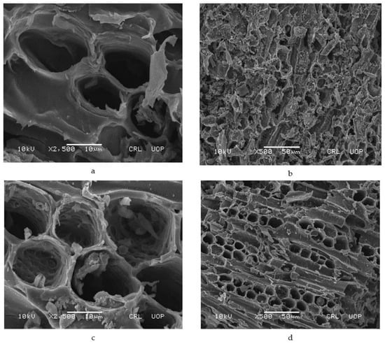 The SEM images of AC as represented in Figure 4a,b manifest non-uniform-sized particles, having uneven and distorted edges. The deposited Fe3O4 could be visualized as spots on MAC’s surface in the SEM images (Figure 4c,d).