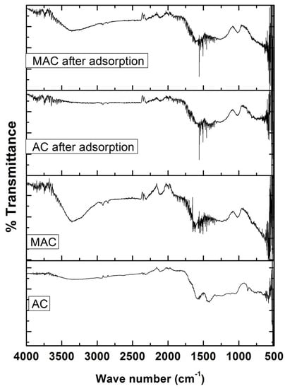 FTIR spectra of AC and MAC before adsorption and after adsorption.