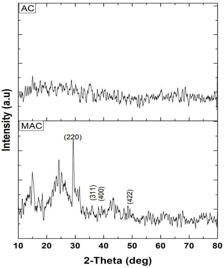 The XRD spectrum of AC (Figure 6) indicates the adsorbent to be amorphous, whereas, according to XRD spectrum of MAC (Figure 6), it is crystalline in nature. Several peaks were observed such as 2θ: 29 (index: 220), 36 (index: 311), 38 (index: 400), and 48 (index: 422) that suggest the presence of magnetite in the composite. Out of the numerous iron oxides present, maghemite and magnetite were deemed to be of special value because of their magnetic properties and their subsequent significance from the environmental perspective [].