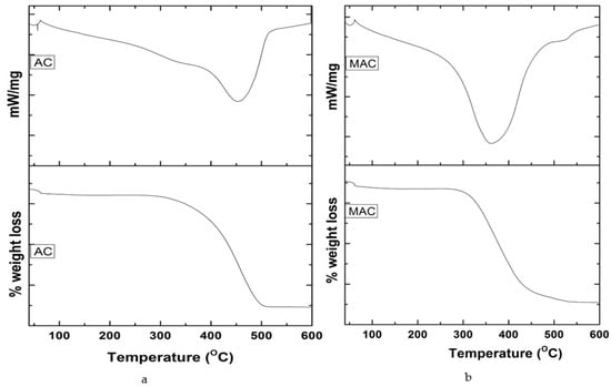 According to the TG/DTA spectrum of AC (Figure 7a), at 60–450 °C, there is a net 60% loss of material initially at the first part of the spectrum, then a second 50.35% loss at the next part of the spectrum, and finally a third net loss (33.99%) of the material noticed in the last part of the spectrum. The initial loss is ascribed to the dehydration, the second loss to degradation of cellulose and hemi-cellulose, and the third to the formation of carbon and ash. Likewise, TG/DTA analysis of MAC (Figure 7b), shows an initial 3% loss at 0 to 60 °C, a second 7% loss at 60–318 °C, and a final third loss (58%) that occurred above 318 °C. The initial loss may be attributed to water evaporation, the second to cellulose’s decomposition, and the third to the formation of carbonaceous residue due to the transition of Fe3O4 to FeO.