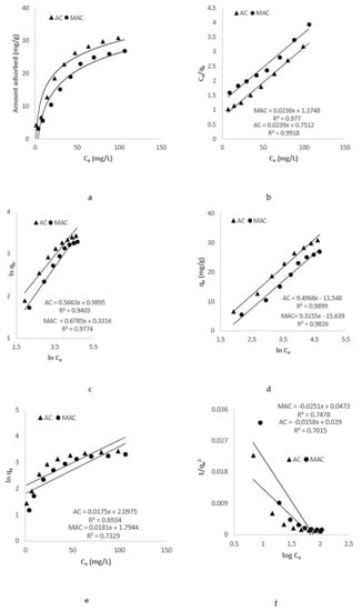 AZM adsorption isotherms. (a) Effect of concentration on adsorption of AC and MAC (b) Langmuir plot (c) Freundlich plot (d) Temkin plot (e) Jovanovich plot (f) Harkins–Jura plot.
