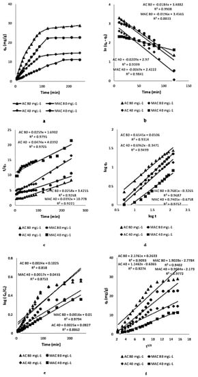 Kinetic study of AZM adsorption by the two prepared adsorbents (Figure 9a) was carried out at two different concentrations viz., 80 and 40 mg/L. An initial higher rate of adsorption for 30 min was observed following the slower rate up to 120 min. Onwards, it became steady and a constant concentration was reached for both AC and MAC. At 120 min, equilibrium was reached. The observation may be explained as follows. Initially, the active sites for AZM adsorption were free and AZM interacted freely with the active sites for adsorption, and the concentration difference between the AZM solutions and the solid interface was initially higher. This led to a higher rate of adsorption—up to 30 min. Afterwards, AZM were accumulated in the large available surface of the AC and MAC, which lead to occupation of surface binding sites causing adsorption to be slowed down. At last, after 120 min, it became steady, till 240 min duration due to the surface being fully saturated []. Various kinetic models, such as Lagergren pseudo-first-order, second-order, power function, Natarajan and Khalaf, and intra-particle diffusion models were applied to calculate the adsorption kinetic parameters.