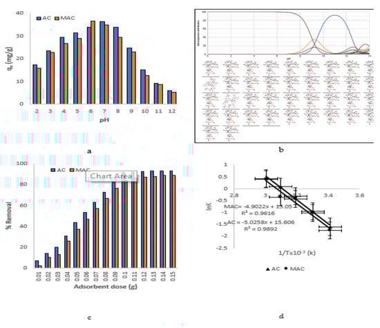 Figure 10a represents the pattern of adsorption by AC and MAC with the varying pH of the solution. The adsorption of AZM on AC and MAC was high at neutral pH. The changes in the AZM adsorption capacity of AC and MAC under different solutions’ pHs were almost the same. Maximum adsorption of AZM adsorption by AC was achieved at pH = 7 while for MAC at pH = 6, respectively. A speciation graph of AZM (Figure 10b) supports the observed changes in pH with varying pH as a unionized form more soluble in water, and the pKa value is round about 8.5 []. At acidic pH it is neutral, while near neutral or slightly above neutral pH is its ionized form, where positive interactions with adsorbent surface groups leads to enhanced adsorption rates in the case of both adsorbents.