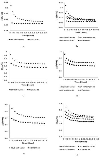 Figure 11a,c,e, represents how AZM could affect the permeate flux of the membranes used i.e., UF, NF, and RO. In the first case, upon the passage of double-distilled water through the three membranes, a decrease in the permeate flux was observed. The observed effect was due to two reasons: (a) membrane resistance, and (b) presence of ions in the water (as proven by the conductance measurement (6.3 × 10−6 S) leads to ionic interaction. A stable permeate flux was then observed on which there was not any significant effect of the varying experimental conditions or time. The pores of the UF membrane, up to a certain extent, were clogged due to the adsorption of AZM that resulted in a low permeate flux, as the high molecular mass of AZM compared to the MWCO of NF and RO membranes led to lower the permeate flux. The improved permeate flux with AC and MAC was compared as shown in Figure 11b,d,f. The improved permeate flux was observed for AZM, when the pilot plant was used in a hybrid manner with AC and MAC. The improved permeate flux for MAC/membranes was greater as compared to AC/membranes. This was due to the accumulation of AC on the membrane surface and caused pores blockage, while MAC was easily removed from the membrane surface by the application of an electromagnet in the pilot plant, leading to an enhancement in permeate flux. The AC had greater adsorption capability as compared to MAC, but fouling dominated over the adsorption capacity.