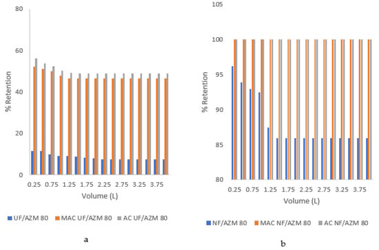 The AZM percent retention is presented in Figure 12a,b. Due to the adsorption of AZM on membrane pores and surface, only 11% retention was seen in case of UF membrane, although the lower mass of AZM relative to the MWCO of UF membrane was suggestive of greater retention. Improved retention after pretreatment with AC (56%) and MAC (52%) were observed (Figure 12a). Likewise, an initial retention (without pretreatment) of 94% was observed in case of NF membrane that got improved to 100% after pretreatment with AC and MAC (Figure 12b). Similarly, in the case of the RO membrane, the observed % retention was 100% after reaction with the adsorbents (data not shown).