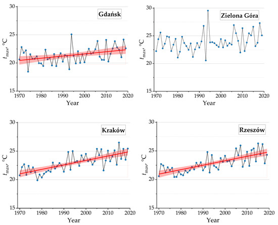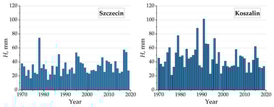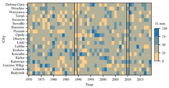 For the daily precipitation index, the criteria for issuing a warning against heavy rainfall in Poland [87] were taken into account. In particular, the lower limit of the rainfall amount for risk level 2 was adopted as a threshold value, with the daily precipitation exceeding 50 mm, where surface flooding of lower set areas and interiors and the first major damage to infrastructure equipment occur.