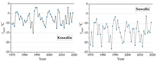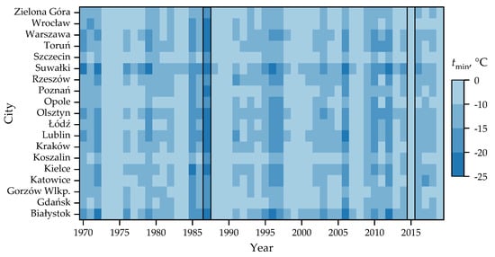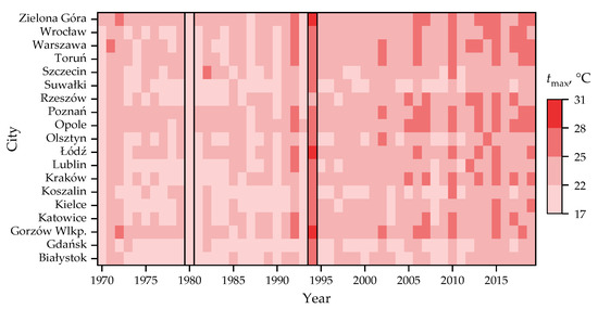These proposed indices should be verified in terms of the frequency of reaching them in Poland. For this purpose, the meteorological data from 19 stations of the Institute of Meteorology and Water Management–National Research Institute (IMWM-NRI) from years 1970–2019 (50 years of observation) were derived. The data derive from meteorological stations located in Białystok, Gdańsk, Gorzów Wielkopolski, Katowice, Kielce, Koszalin, Kraków, Lublin, Łódź, Olsztyn, Opole, Poznań, Rzeszów, Suwałki, Szczecin, Toruń, Warsaw, Wrocław, and Zielona Góra (Figure 1).