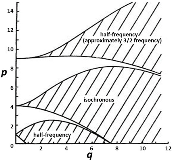 18]. If a characteristic number and an amplitude of vibration (p, q) lie in any concealed area of the stability diagram as shown in