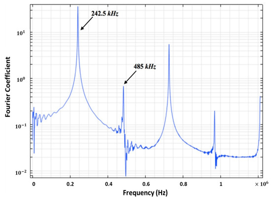 Figure 3). It shows that the beginning vibrational amplitude occurred at the assigned frequency of 485 kHz. Further, the wavelength of the capillary surface wave is 19.4 μm, as determined from