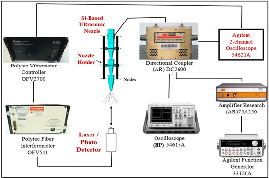 Figure 5. The pair of PZTs of the silicon-based, ultrasonic spout is driven by the exchanging flow (AC) electrical signal from an Agilent Function Generator Model 33120 A after enhancement by Amplifier Research Model 75 A250 (Amplifier Exploration, Souderton, PA, USA). An Agilent 2-channel Oscilloscope 54621A screens the AC drive signal and gives an outside setting off of the Polytec Ultrasonics Vibrometer Controller Model OFV2700 (Polytech GmbH, Waldbronn, Germany). The regulator is essential for the Polytec laser Doppler vibrometer (LDV) that additionally contains a Polytec Fiber Interferometer Model OFV 511.