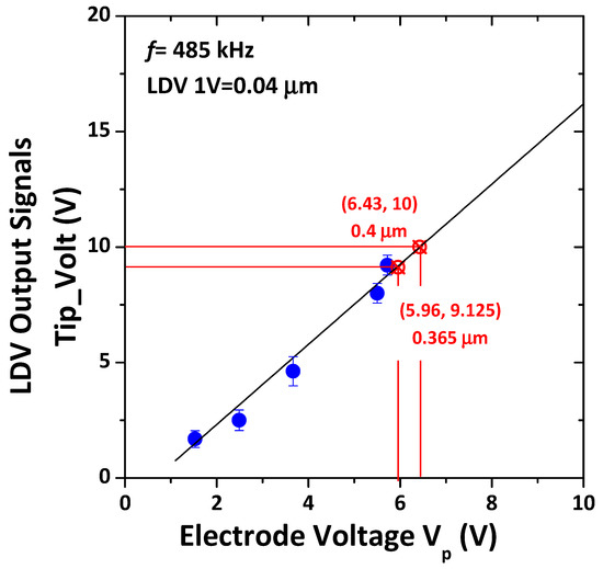 Figure 7, the results are depicted in blue color. The calibration line is a function of the electrode voltage. The red coordinate (5.96, 9.125) on the calibration line is the suggested onset vibrational amplitude of 0.365 μm as the critical longitudinal displacement of capillary waves from modeling. The red coordinate (6.43, 10) confirms the linear regression of the applied electrode voltage for the Polytec LDV output signal in experiments. Note that the Polytec LDV output signal 1 V = 0.04 μm longitudinal displacement.