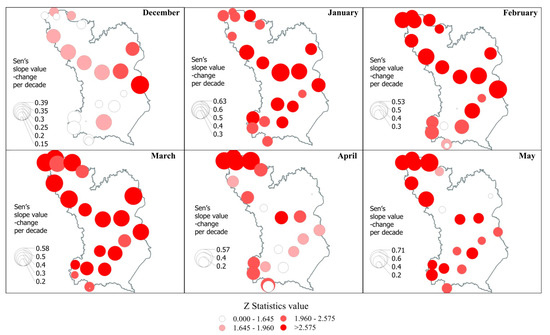 Changes in the maxima of annual minimum temperatures for all examined stations are presented in Figure 2. The degree of change per decade is expressed by the size of a marker, and the significance of changes by the coloured scale. Statistically significant changes are marked with a darker colour scale (dark red colour). The directions of changes for all stations are consistent. At all analysed stations, an increase of daily minimum temperature maxima over 70 years is observed. For December, the range of change varies from 0.2 °C to 0.4 °C, they are not as pronounced as in the following month. For January the changes are larger, up to 0.6 °C per decade (the most substantial changes at the stations Warszawa, Siedlce and Włodawa). For both months the largest changes are observed in the central part of the catchment. In the case of January, for most of the stations, positive directions of changes are statistically significant at a 0.05 level. For December, statistically insignificant changes prevail. In February, only in the south-western part of the study area, positive directions of changes are not statistically significant (Figure 2). Changes in that month vary from 0.2 °C to 0.52 °C. March, similarly to January, is characterized by statistically significant changes for the entire area under study. It is worth noting that in that month the positive directions of changes are very clearly visible (compared to January) also at the stations in north-western Poland and the changes range from 0.2 °C to 0.58 °C. In April, stations with statistically significant changes continue to cluster in the north-western part of the study area, in the central belt and the south-western part. In that month we still observe the predominance of stations with statistically significant changes (increase within the range of 0 °C–0.56 °C). In the following month, there are only three stations with the statistically insignificant increase of maximum minimum temperature. In the case of May, we observe the largest change per decade at the Hel station (0.70 °C). At five stations, the changes are at the level of 0.46 °C–0.56 °C.
