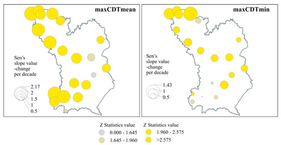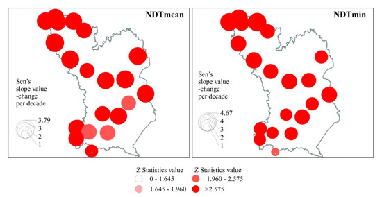 Figure 3 presents changes in the number of days with average daily and minimum daily temperatures above 0 °C for all examined stations. Similarly, to the previous indicator, a degree of change per decade is expressed by the size of the marker, and the significance of the changes by the coloured scale. Statistically significant changes are marked with a darker colour scale (dark red colour denotes the most significant changes).