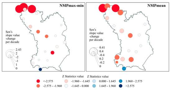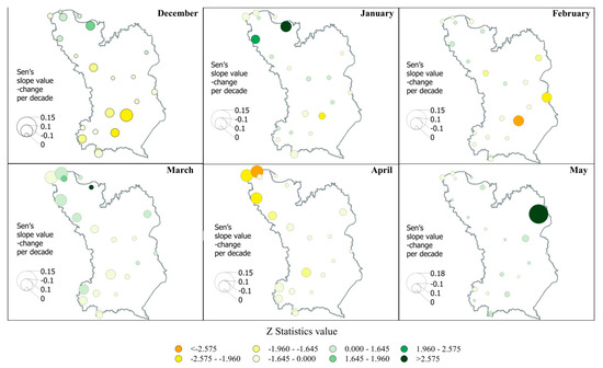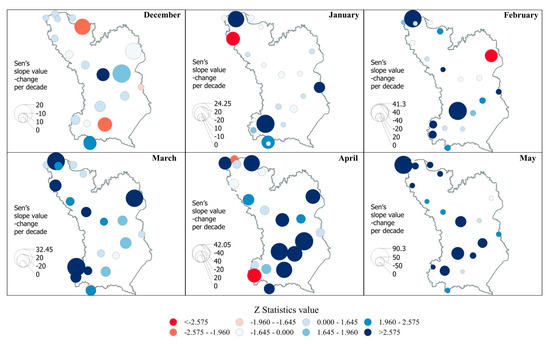 As can be seen in Figure 8, the precipitation changes can be positive or negative, unlike those of maxima of annual minimum temperatures. In winter (Figure 8—upper panels) changes per decade at individual stations ranged from −30 mm to 41 mm. The highest range of changes was observed for February (−30 mm–41 mm), the lowest for December (−17 mm–19 mm). In spring (Figure 8—lower panels), the range of changes is larger (from −28 mm to 90 mm). The largest differences in directions of changes are observed in May (−17.3 mm–90.0 mm) and the smallest in March (−11.7 mm–32.4 mm).