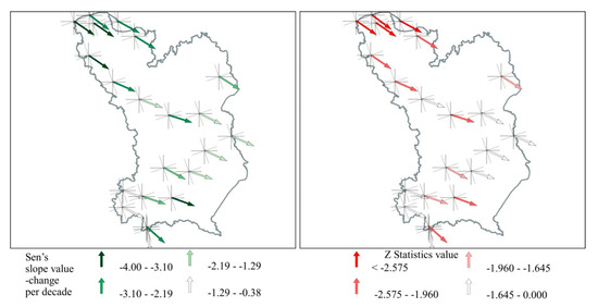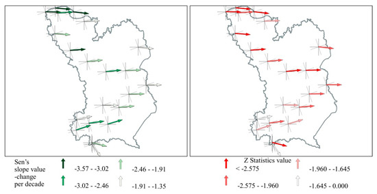 At all stations, we observe an arrival of first five consecutive days with spring temperatures on average 2.4 days earlier (Figure 6—left hand panel). For most stations, these changes are statistically significant (Figure 6—right hand panel). The largest changes (dark green colour of arrows) are observed in the north-western part of the catchment area, reaching 3.57 days at Łeba. They are also quite high in the southern part, in Katowice, Kraków and Tarnów (statistically significant only in Kraków). In the middle zone of the area under study, we observe statistically significant changes within two to three days.