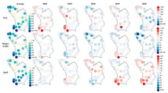 Long-term trends of changes in precipitation amounts in individual months (I–IV) did not show any decrease in the studied catchment over the years 1951–2020. However, there are winters and springs with precipitation that differ significantly from the multi-year norm (Figure 9). In studied catchment, seasonal precipitation during colder half of the year should improve the soil moisture conditions after warm or warm and dry spring and summer. Otherwise, at the beginning of the next warm season, moisture conditions can be too low and can lead to a drought. Winter–spring supply is very important, negative deviations from annual norms are very unfavourable especially in the initial phase of the growing season. In the years when Poland and Europe experienced severe droughts (2003, 2015, 2018, 2019, 2020), most of the study area had negative precipitation anomalies of various magnitudes, varying spatially (Figure 9). Attention is drawn by very unfavourable conditions in April in the following three years (2018, 2019, 2020), whose apogee was observed in 2020. Cumulative water shortages in recent years have contributed to the development of a severe drought in 2020.
