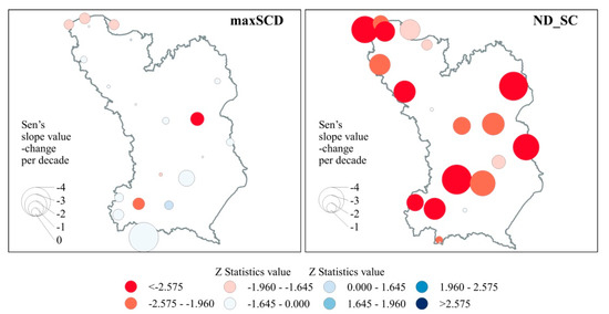 Spatial variability of temporal changes in maximum snow cover depth in winter months (January, February March) in 1951–2020 is presented in Figure 10 (left hand panel). Negative direction of changes was observed at most stations, but only three of them were statistically significant (Zakopane—−3.3 cm per decade, Siedlce—−1.7 cm and Krakow—−1.5 cm). Four stations did not show any changes in snow cover depth (Lębork, Elbląg, Płock and Lublin).