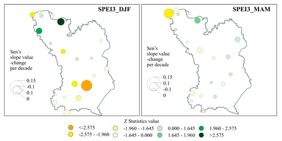 Spatial variability of temporal changes in SPEI3 for winter and spring in 1951–2020 is presented in Figure 11. In winter, changes indicating deterioration of wetness condition prevail (south part of the catchment). In the spring, changes are very small (statistically insignificant in most cases). Comparison of those results with monthly SPEI1 indicates that we get more insight into drought variability using the later.
