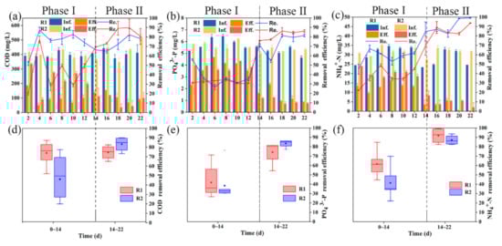 Profiles of influent and effluent concentration, removal efficiency: (a) COD; (b) -P; (c) -N; and boxplot of removal efficiency of two group reactors during the reactivation process: (d) COD; (e) -P; (f) -N. (R1: Aeration; R2: Non-aeration).