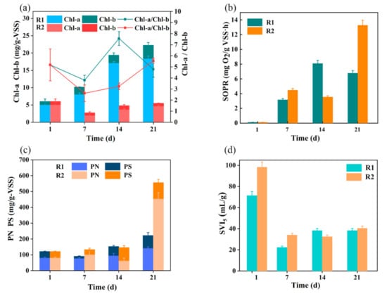 Figure 2d shows the initial SVI5 of 71 mL/g and 98 mL/g in R1 and R2 respectively, resulting in relatively poor settle ability. After 21 days of full activation, SVI5 were stabilized at 38 mL/g and 40 mL/g in R1 and R2, respectively (Figure 2d), with all granules recovering excellent settle ability, which could be reflected by the increased EPS content and microalgae growth [22,33], as indicated in Figure 2a,c.