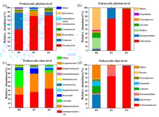 Microbial community of microalgal-bacterial granular sludge at phylum and class levels (>1% relative abundance). (a) prokaryotic phylum; (b) eukaryotic phylum; (c) prokaryotic class; (d) eukaryotic class. (R0: Initial; R1: Aeration; R2: Non-aeration).