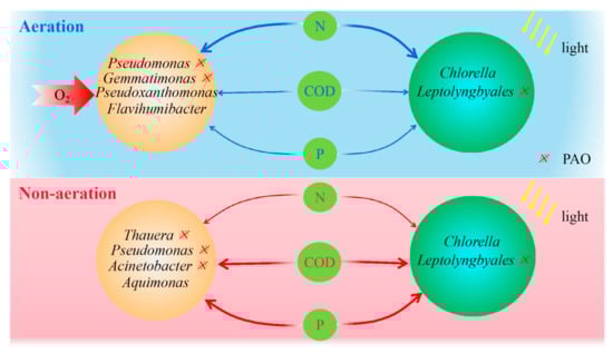 Possible pollutant removal pathways based on key functional microbial groups in the microalgal-bacterial granular sludge process under aeration and non-aeration conditions.