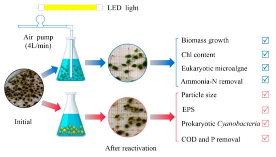 The following are available online at https://www.mdpi.com/article/10.3390/w13141974/s1, Figure S1: Variation in morphological appearances of microalgal-bacterial granules (a) Aerated PBR; (b) Non-aerated PBR during the reactivation process, Figure S2: Microbial community reflected by microscope and SEM of microalgal-bacterial granules. Aerated PBR: (a) microscope; (b) SEM. Non-aerated PBR: (c) microscope; (d) SEM, Figure S3: Particle size distributions of microalgal-bacterial granules after reactivation. (R1: Aeration; R2: Non-aeration).