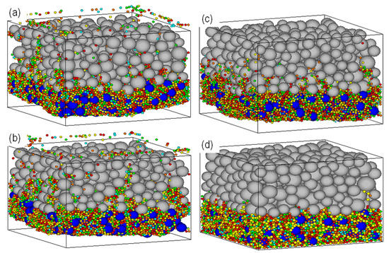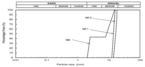 The simulated systems comprised of a 0.03 m thick layer of gap-graded base soil NB (Figure 1), which is a widely used core material in embankment dams that exhibits greater potential for seepage-induced piping and two uniform filters NF1 and NF2 of thickness of 0.06 m each. Two separate base-filter systems consisting of spherical particles are modeled in a cuboid (0.12 m × 0.12 m × 0.09 m) within five fixed walls (Figure 2). These thicknesses were selected based on a twofold rationale, namely, (1) keeping the size ratio between the smallest cell dimension and the largest particle size well above 5 to avoid potential boundary effects, and (2) in line with the existing studies to accommodate enough particles. For instance, the base layer thickness is 30 mm, while the largest erodible base particle size is 2.8 mm, which yields a size ratio of 10.9 for this study. Note that the conventional definition of relative density (Rd) does not apply to the DEM assemblies [17]; therefore, the base-filter systems were modeled at a target porosity of 50% to indicate a medium dense and stable assembly for which Rd ≈ 50% could be assumed. Prior geometrical assessments using retention criteria of Terzaghi [18] (), NRCS [19] (), and Indraratna et al. [20] () have been made. Here, and represent the particle size at 15% finer by mass and controlling the constriction size at 35% finer by surface area for the filter soil, respectively. , , and represent base soil particle sizes at 85% finer by mass, regraded base particle size at 85% finer by mass, and base particle size at 85% finer by surface area, respectively. It revealed that both the filters NF1 and NF2 were ineffective in retaining the base soil-NB (potential for ineffectiveness; NF2 > NF1), but they were individually internally stable [21,22]. The base particles were assigned different colors according to their group sizes to visualize their positions during the simulations. Similarly, the z-positions of the eroding particles were monitored to determine the particle infiltration depths and hence the retention capacity of the filters.
