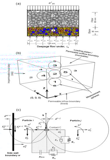 where and g define the combined effect of fluid forces on the particles and acceleration due to gravity, respectively. Notably, the resultant fluid force is applied at the centroids of particles. The coupling is implemented in the form of data exchanges during the calculation cycle that involve solving Equations (A1)–(A5) for the updated particle positions, contact forces, and porosity of fluid elements in PFC3D and then Equations (A6)–(A11) are solved for the fluid velocity and pressure gradient in each fluid element [27]. The fluid force moves the solid particles, resulting in porosity deteriorations for different fluid cells, which subsequently affect the fluid flow rate of the grids. The magnitudes of effective stresses in the base () and filter () could be quantified using the following relationships [22]: