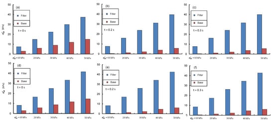 Figure 5b,c show the spatial distributions of eroded base fines captured at various depths inside the filters at t = 0.2 s and 0.3 s, respectively. In both cases, the computed values were higher near the interface, because the hydraulic gradients were higher at the interface than elsewhere, and gradually decreased with the filter depth. Notably for the given values, a significant amount of base fines could reach the downstream filter boundary at relatively smaller magnitudes of applied effective stresses, i.e., ≤ 20 kPa. These fines could have eroded further had either the magnitude of increased or that of reduced. Interestingly, the magnitudes of eroded fines ( values) for effective base-filter systems were insensitive to the simulation time because the steady-state conditions could be reached until t = 0.2 s. In contrast, the continuous erosion from ineffective base-filter systems at t > 0.2 s resulted in markedly increased values, as shown by red lines in Figure 5b,c.