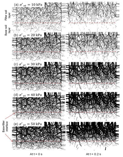 Figure 4 shows the contact force fc distributions for specimen NF1-NB when subjected to = 10–50 kPa. The initial contact force, fc, and hence the contact stress distribution within the filter layer is almost uniform for the given , but it is reduced significantly inside the base soil layer, although there too it remained uniform. This substantial reduction during transfer from the filter to the base soil clearly indicated that the magnitudes of stress reduction factor () in Appendix B for the current base-filter systems were less than unity. Similarly, the magnitudes of inside both the base and the filter layers markedly increased with the corresponding increase in . The final fc distributions (at t = 0.2 s) in the filter remained almost the same compared to the base, wherein the seepage stresses markedly reduced the base particle contact stresses.