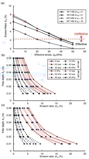 where define the number of eroded and original base particles and their respective radii. The filter was divided into six equal layers of 0.01 m each, and the quantities of eroded base fines and their respective values were calculated. Based on the published DEM studies, a filter exhibiting < 2.25% could be considered effective [24]. Figure 5a presents the correlation between and , NF1-NB exhibited relatively smaller compared to NF2-NB at = 0 and their magnitudes decreased significantly with the increase in the magnitudes of . For instance, at = 35, the specimen NF1-NB exhibited reductions in from 6.3% (ineffective) at = 0 to 2.0% (effective) at = 40 kPa, which reduced further to almost 0.95% (effective) at = 50 kPa. Similarly, at = 20, NF2-NB showed reductions in from 7.5% (ineffective) at = 0 to 1.4% (effective) at = 50 kPa. Notably, when sample NF2-NB was subjected to = 35, a subtle increase in the magnitude of was observed. However, subjecting NF1-NB to a relatively smaller = 20 at the same stress levels could substantially reduce the values to almost half of that at = 35. It clearly depicted that the erosion and hence the effectiveness of a base-filter system would be significantly influenced by the magnitude of applied hydraulic gradient.