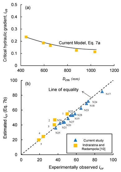 Figure 6a,b plot the critical hydraulic gradient values for unit displacement and complete erosion of base particles versus those predicted by the above Equation (7), respectively. Not surprisingly, the magnitudes of computed through Equation (7) agree closely with those recorded during the numerical simulations of this study, and it may be because both models consider the particles to be spheres. Nevertheless, the values of the critical hydraulic gradients would be expectedly higher for actual granular soil particles (i.e., non-spheres). It clearly establishes that the values of obtained from Equation (7) would be conservative when applied to the actual field conditions. Therefore, this study adopts both Equation (7) to capture the unit displacement and the complete erosion of base particles through the filter layer (i.e., unit displacement approaching ), respectively. Furthermore, the additional hydraulic gradient () arising due to the normal loading needs to be overcome for once by hydrodynamic forces to dislodge an erodible fine and induce unit displacement (i.e., initiation of erosion) and can be given by (Appendix B):