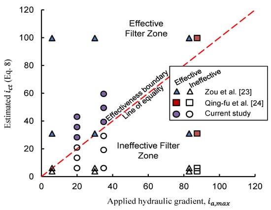 Table 2 presents the results of numerical data of this study plus those adopted from the published DEM studies for validation. In Figure 8, the magnitudes of maximum applied hydraulic gradients during DEM simulations, , and those predicted by the proposed model, (Equation (8)), were plotted. The line of equality demarcates a visible boundary between effective and ineffective base-filter systems, whereby the ones plotting on its right were deemed ineffective and vice versa. The assessment results of filter effectiveness shown in Figure 8 have been quantified in Table 2 in the form of effectiveness of a filter in fully protecting the base soil. For brevity, the current model assesses a filter as ineffective should the applied hydraulic gradient be greater than its anticipated value (Equation (8)). Then, this assessment is compared with the actual DEM response observed in this study or that reported in the adopted works. As Table 2 shows, out of 40 simulation results from three independent DEM studies including the current work, only five incorrect assessments (i.e., two conservative assessments including N3 and N10 and three unsafe including N11, N25, and N39) are obtained by the currently proposed theoretical model. This acceptably smaller discrepancy in numerical results and theoretical assessments of this study could be because the proposed model is an explicit solution using a continuum approach, while CCFD-DEM simulations of this study capture micro-mechanical responses at the fluid–particle level.