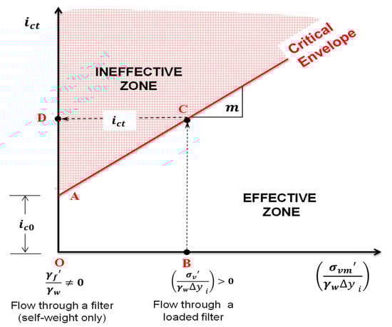 A graphical illustration of the proposed theoretical hydro-mechanical envelopes (Equation (8)) governing the migration of base particles in loaded filters is presented in Figure 9. It followed a straight-line relationship with the dimensionless mechanical constraint (), having a slope equal to the unit (Equation (7)). This definition of slope is more realistic because the proposed envelope for a given base-filter system tends to be unique by the virtue of its physical properties. For an internally stable filter under = 0 (i.e., with no additional surcharge on the filter layer except the self-weight), the can be estimated by the ordinate intercept (OA) of the theoretical envelope in Figure 9. Almost all the inter-particle contacts are mechanically active in an internally stable soil [25]; thus, any value of > 0 can help a filter resist the erosion of particles by virtue of the increased mechanical and frictional constraints. In turn, this requires larger values to trigger the migration of base particles (path BCD), thus imitating Terzaghi’s [6] recommendation of using inverted loaded filters to avoid quicksand conditions at the toe of embankment dams.