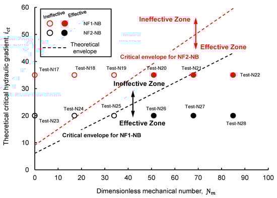 In Figure 10, the applied and the values for the numerical simulation results of this study are plotted with the corresponding theoretical envelopes for the base-filter systems NF1-NB and NF2-NB. Apart from a single incorrect assessment NF1-NB-30 (i.e., test N20 in Table 2), the rest of the base-filter systems are correctly plotted in their respective effective and ineffective zones by the proposed model. Nonetheless, based on the geometrical and mechanical factors, the proposed theoretical envelopes governing base particle erosion for a given base-filter system should be unique.