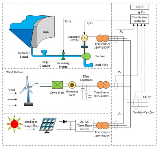 Schematic diagram of wind/solar/hydropower integrated system. Images of wind turbine, PV generator, and electric load from the ref. [20].