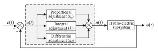 Block diagram of the PID controller in hydropower system. Parameters kp, ki and kd are the proportional adjustment coefficient, integral adjustment coefficient and differential adjustment coefficient, respectively.
