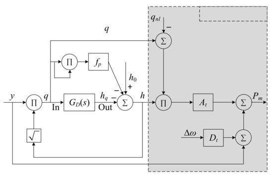 where At, q, h, fp, pm, qnl, △ω, Dt, and y denote the hydro-turbine gain, relative deviation of hydro-turbine flow, relative deviation of hydro-turbine head, relative head loss coefficient in penstock, mechanical output power, relative no-load flow, relative deviation of hydro-turbine rotational speed, damping factor, and relative deviation of guide vane opening, respectively. Thus, the block diagram of the hydro-turbine is performed in Figure 4.